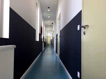 Alle lokalen zijn voorzien van screens waardoor het lokaal volledig verduisterd kan worden. Dit gebeurt via de regiekamer. Tevens kan u het licht aan- en uitdoen in de kamers. Alle ruimtes zijn voorzien van camera’s, die permanent opnemen. Hierdoor kunnen de oefeningen/trainingen niet enkel live gevolgd worden in het leslokaal (30 personen), maar ook herbekeken worden.