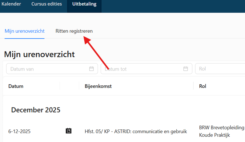 In het overzicht van je gepresteerde opdrachten (zie FAQ hierboven) zie je de knop ‘Ritten registreren’. Klik hier op.