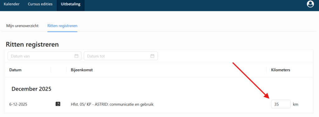 Je ziet nu een overzicht van jouw opdrachten. Per opdracht kan je rechts je gereden kilometers ingeven. Deze worden automatisch opgeslaan nadat je wegklikt uit het invoerveld.