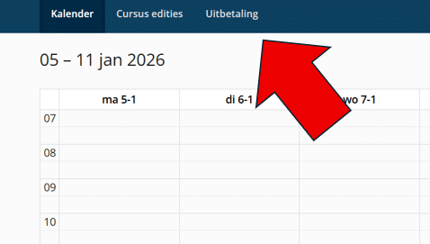 Als je ingelogd bent als docent zie je op de startpagina in de blauwe balk de knop ‘uitbetaling’. Klik hier op.